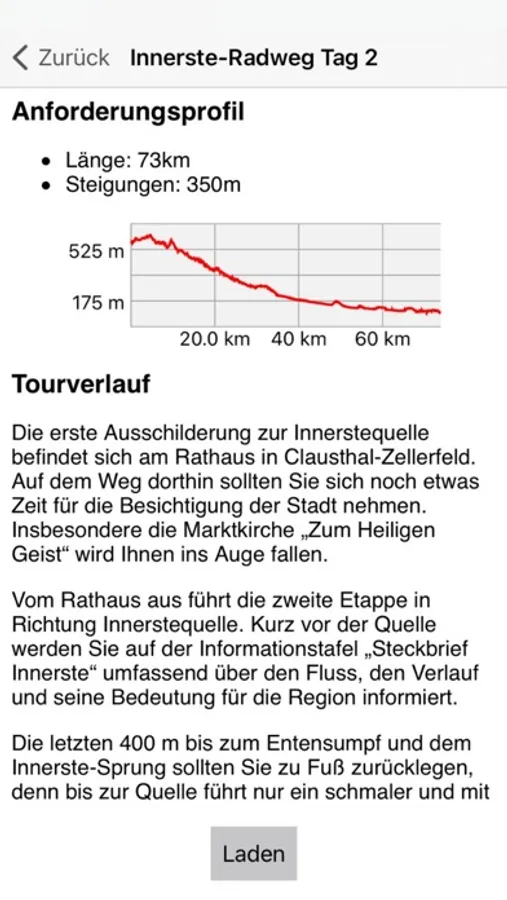 Zu den Touren können eine ausführliche Beschreibung mit vielen Informationen wie Länge, Höhenmeter, Schwierigkeitsgrad und der Routenverlauf mit Hinweisen zu den POIs (interessante Orte) aufgerufen werden. Zu jedem POI gibt es Tipps und Empfehlungen. Ist eine passende Tour gefunden, so kann diese aufgerufen werden und der Startpunkt erscheint sofort in der Karte. Ihre aktuelle Position wird ständig angezeigt und nachgeführt.