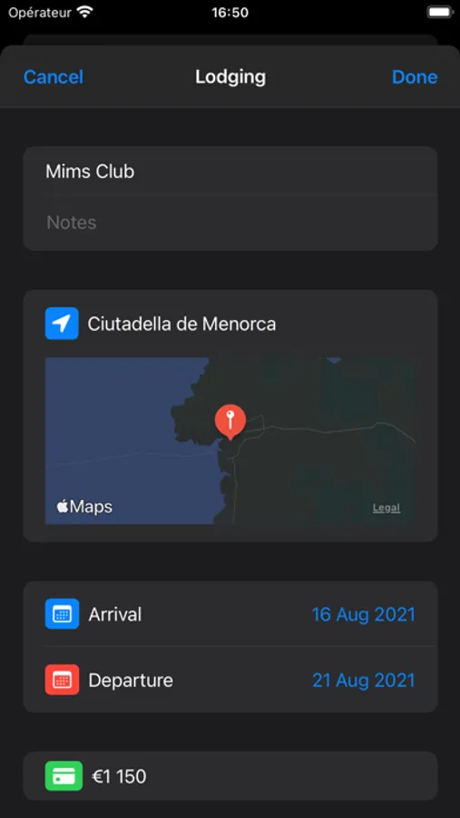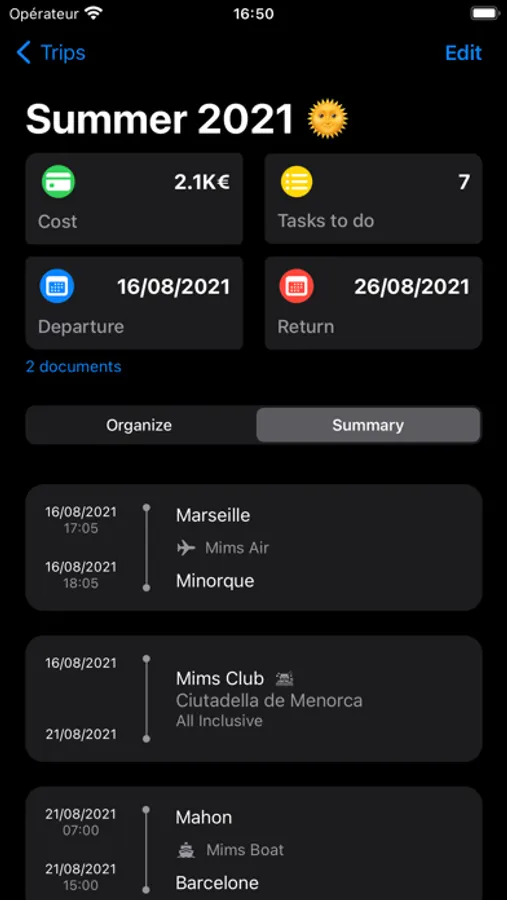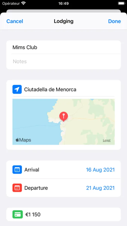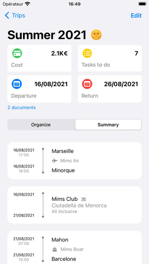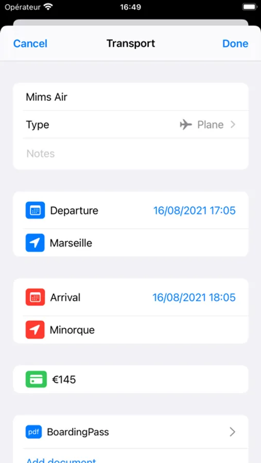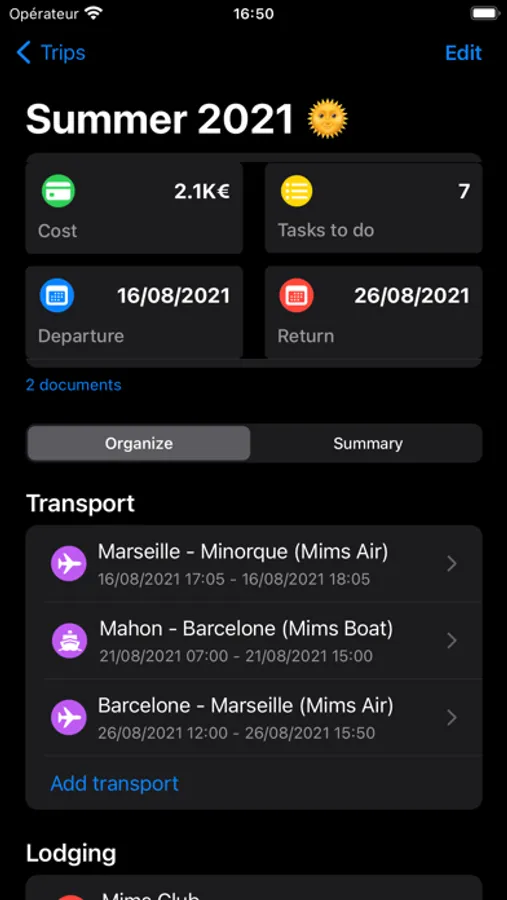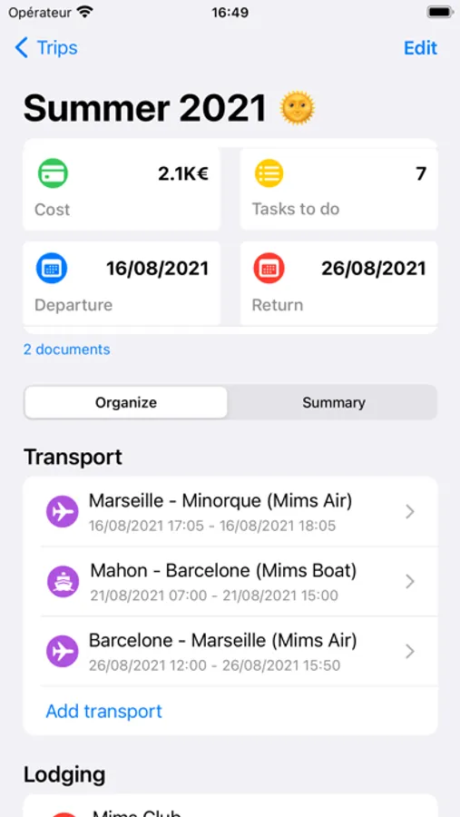 Add the different stages of your trip: transportation (train, bus, car, cab, plane, boat), accommodation (hotel, club, camping ...).