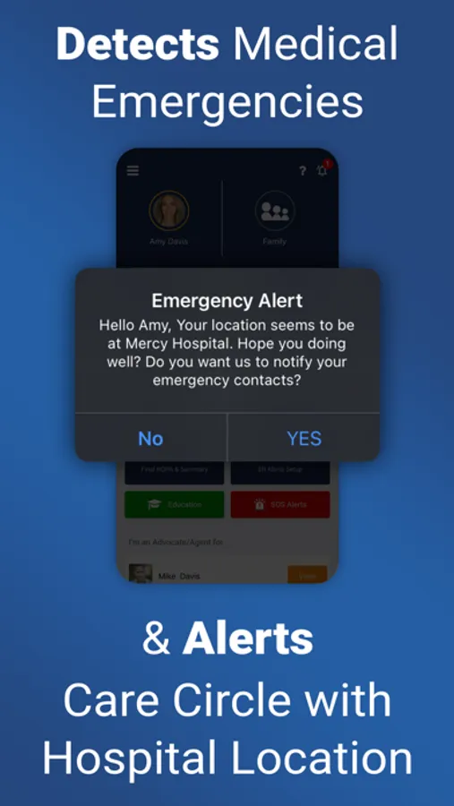 - Alerts your loved one’s Care Circle the moment their phone detects them entering a hospital, letting the Care Circle know the hospital location, directions, and contact details.