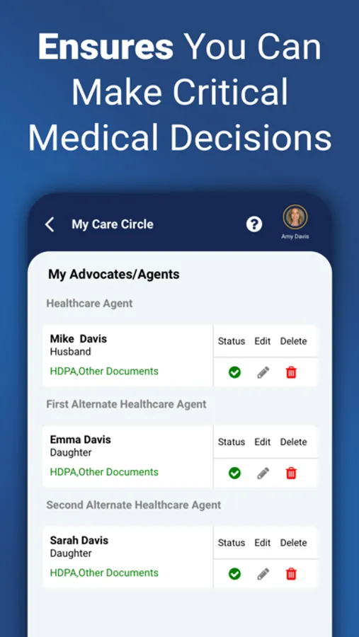 - Allows your family to select their Care Circle composed of a Healthcare Agent and Emergency Contacts.