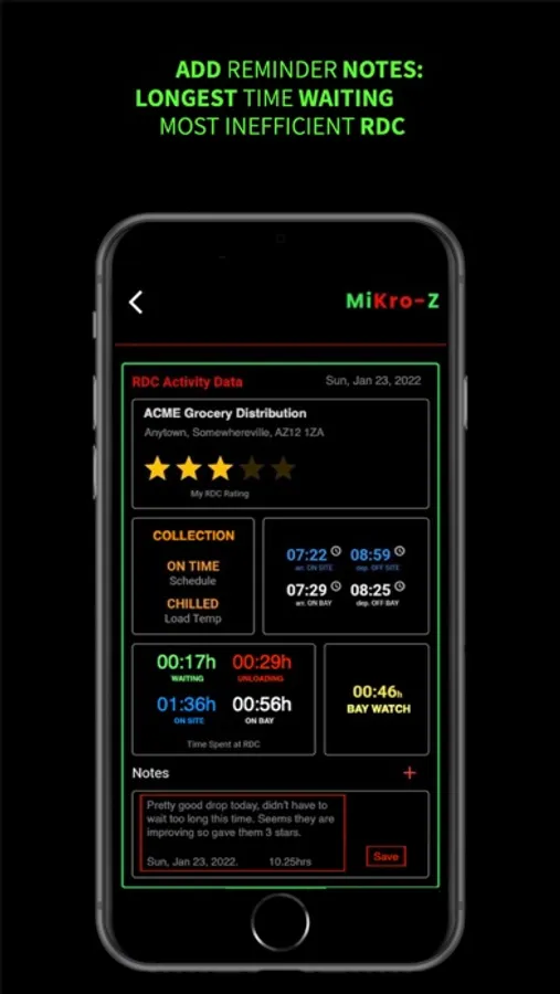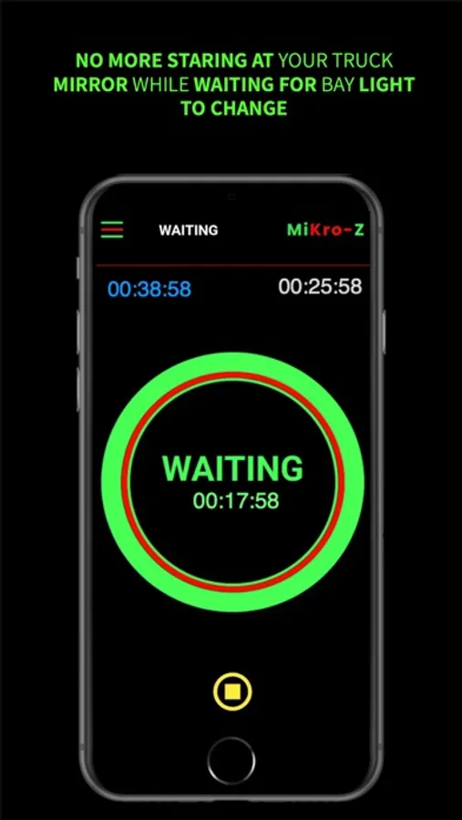 The MiKro-Z app enables Truckers to build a time-stamped searchable record of how long key operational processes take at each Distribution facility they visit including; time spent ON SITE and ON BAY; And where loading bay signal lights are in use, be able to take advantage of the app’s unique patent pending feature to automatically monitor changes in the status of the bay lights - instead of having to keep looking at their truck mirror - to record how much time is spent WAITING, LOADING and UNLOADING; enabling a trucker to Recharge a little in their cab until their vehicle is ready to go, and they are back on the road again.