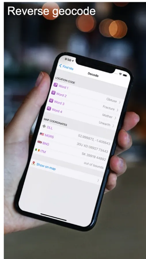 The FindMe Decode application will allow you to reverse geocode your 4 words into commonly used map coordinates for each included country. Different words can be easily selected to provide a complete reverse-geocode facility.
