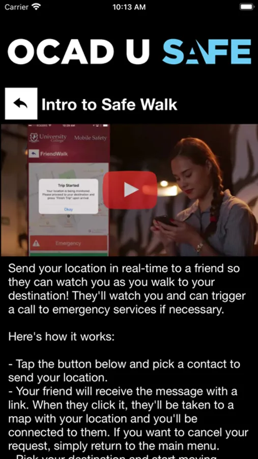 - Safe Walk: Send your location to a friend through email or SMS on your device. Once the friend accepts the Friend Walk request, the user picks their destination and their friend tracks their location in real time; they can keep an eye on them to make sure they make it safely to their destination.