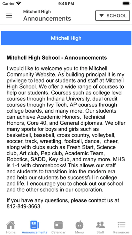The Mitchell Community Schools app for iPhone, iPod, and iPad allows student, faculty and parents to keep up to date with school communication. The app’s intuitive navigation provides quick access to the following: