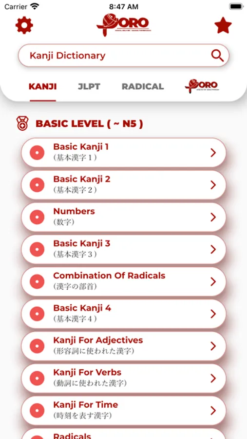 PORO Japanese Kanji application's content included 2500 Kanji of all levels from Kanji N5, Kanji N4 to Kanji N3, Kanji N2 and Kanji N1 which are divided into 231 topics, covering almost kanji of all levels, to help practice and reinforce your Japanese Kanji.