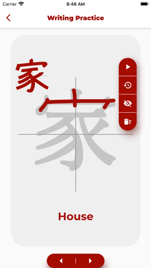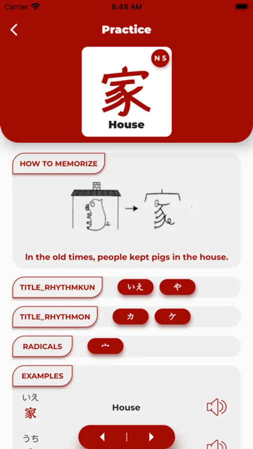 • Swipe to quickly to test your remembering of that kanji and also to move to another kanji to learn