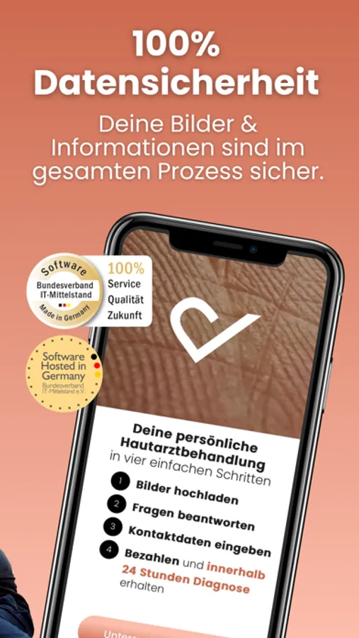 You can contact your treating dermatologist at any time if you have further questions. All of this is done online with 100% data security, thanks to the highest data protection standards – because our app is made in Germany.