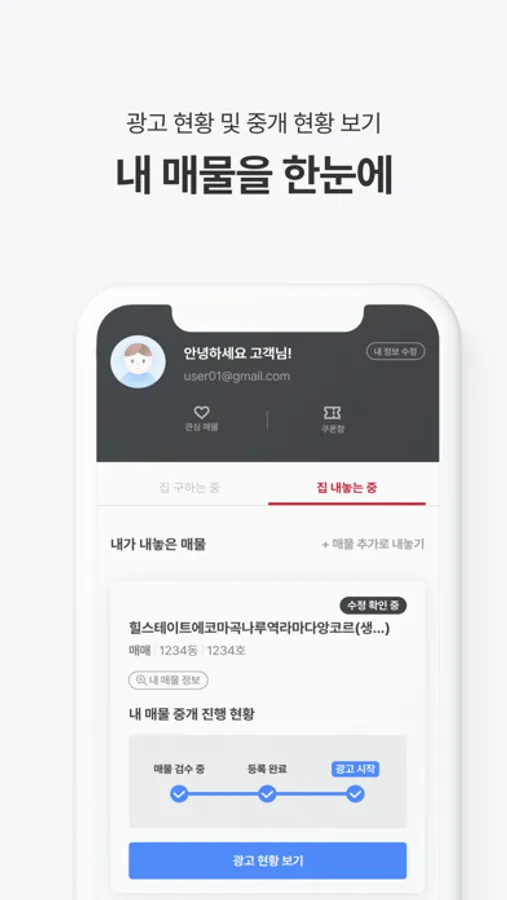 • 내가 내놓은 매물의 광고 등 중개 현황을 확인하고 수정 요청할 수 있어요.