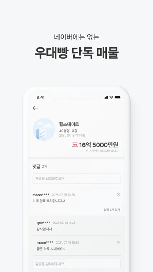 • 거래 완료 즉시 실거래 정보를 고객에게 제공하여 국토부보다 한 달 빠른 거래 정보를 확인할 수 있어요.