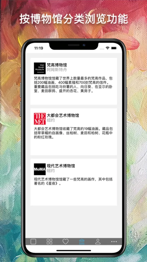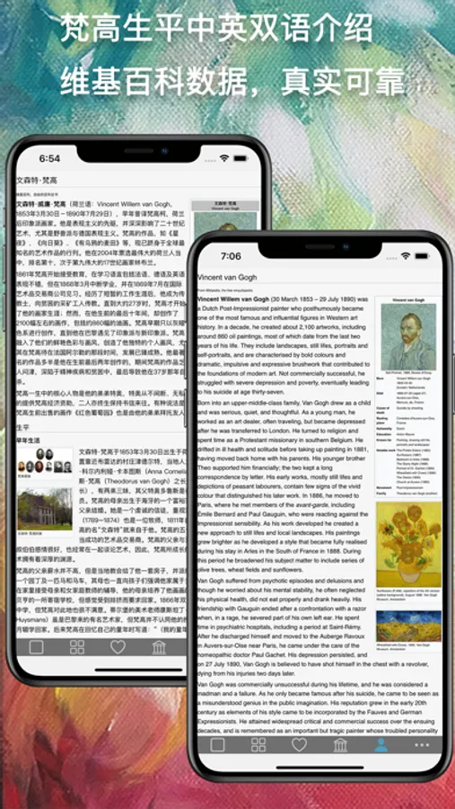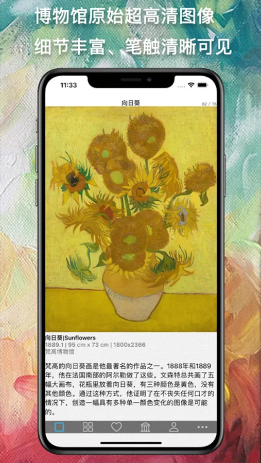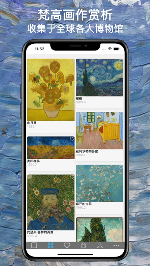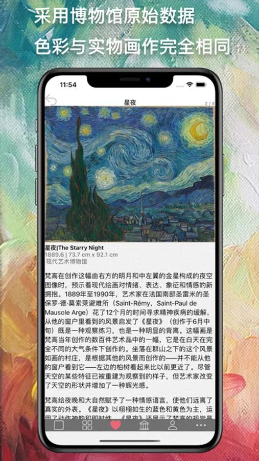 本APP计划从全球各大美术馆、博物馆收集整理梵高的全部油画作品。所有画作均为美术馆、博物馆的原始图像数据,以确保图像色彩与原画色彩的一致性。