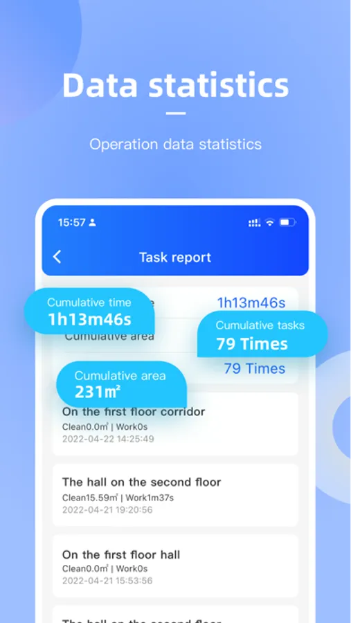 Users can view the historical operation data of the machine, the cumulative working hours, cleaning area and cleaning times, as well as the report of each task.