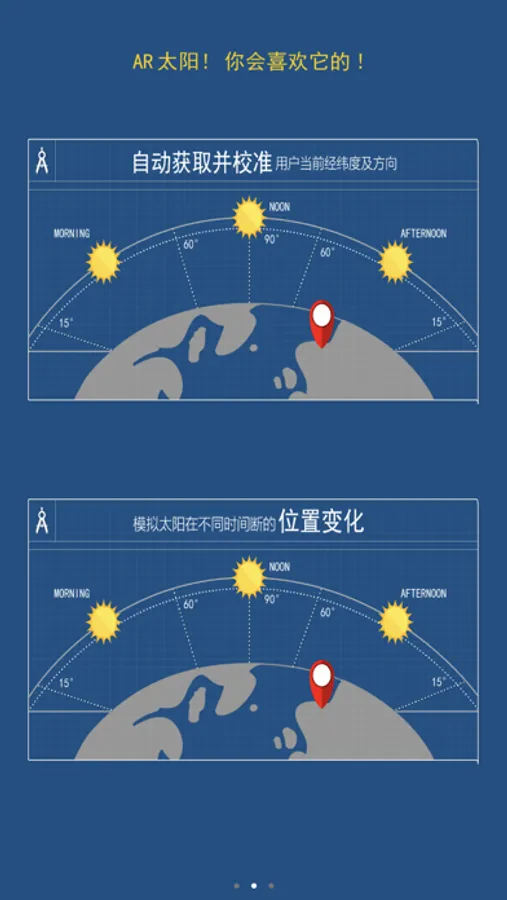 这是一款简单实用的太阳定位工具,运用了目前最先进的AR定位技术,用户不需要任何专业的知识,只需要打开软件、扫描地面就可以通过手机屏幕直观地看到所在地区任意时刻的太阳位置。除此之外,用户还可以通过创建轨迹点的方式,看到太阳全天的运行轨迹及全年日出、日落点的轨迹。一般用户使用这款软件可以直观地了解到房间全年的日照情况或者安装太阳能路灯时选择合适的朝向。老师也可以通过这款软件直观地向学生介绍太阳运动规律的相关概念知识并且通过设置不同的经纬度说明不同地方太阳变化的差异。