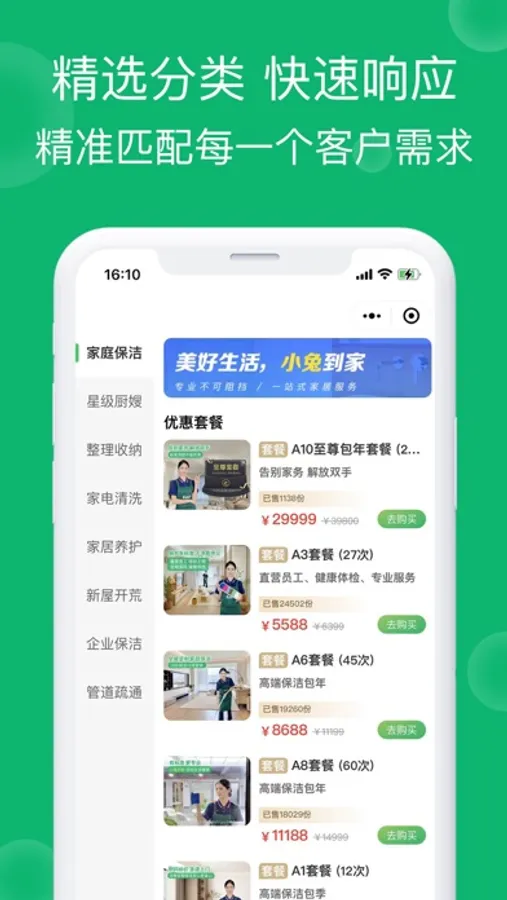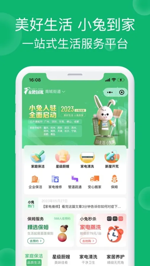 小兔到家主要提供家政服务。家政服务包括家庭保洁、整理收纳、家电清洗、家电维修、家事保姆、新屋开荒、墙面刷新、星级月嫂八大品类服务;