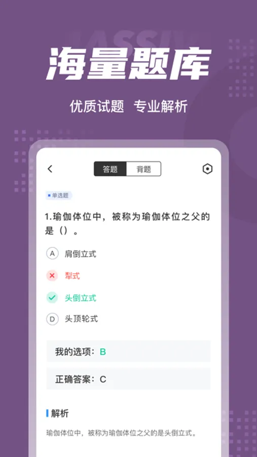 瑜伽教练考试聚题库包含了瑜伽教练考试等课程的历年真题集模拟试题题型,题库中的试题全真模拟真实的考试,是各位考生学习乃至通过考试的好帮手。
