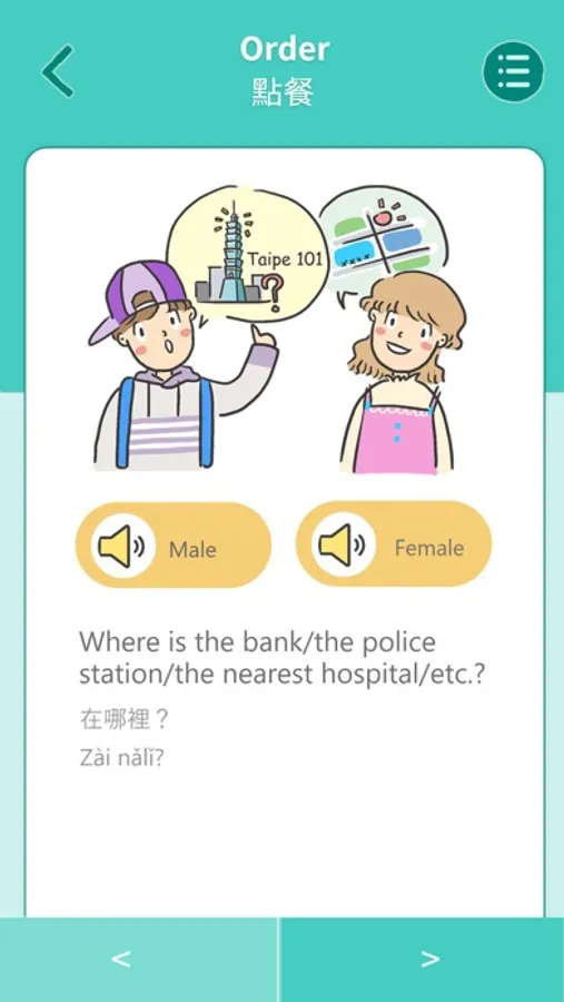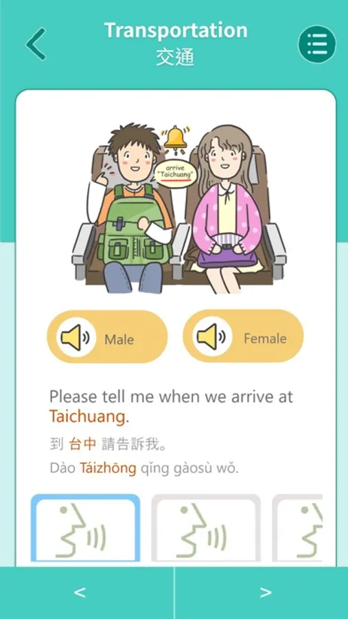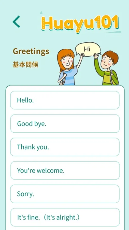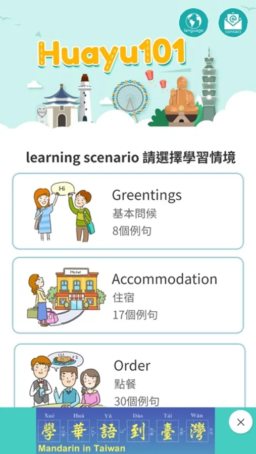 The chapters of learning scenarios that collect dialogues for everyday Chinese, encompassing “Greetings,” “Accommodation,” “Shopping,” “Order,” “Transportation,” “Asking for help,” “City tour,” “Arts and cultural activities,” “Call and reservation,” “Cash exchange,” “Making friends,” and “Hospital and post office.”
