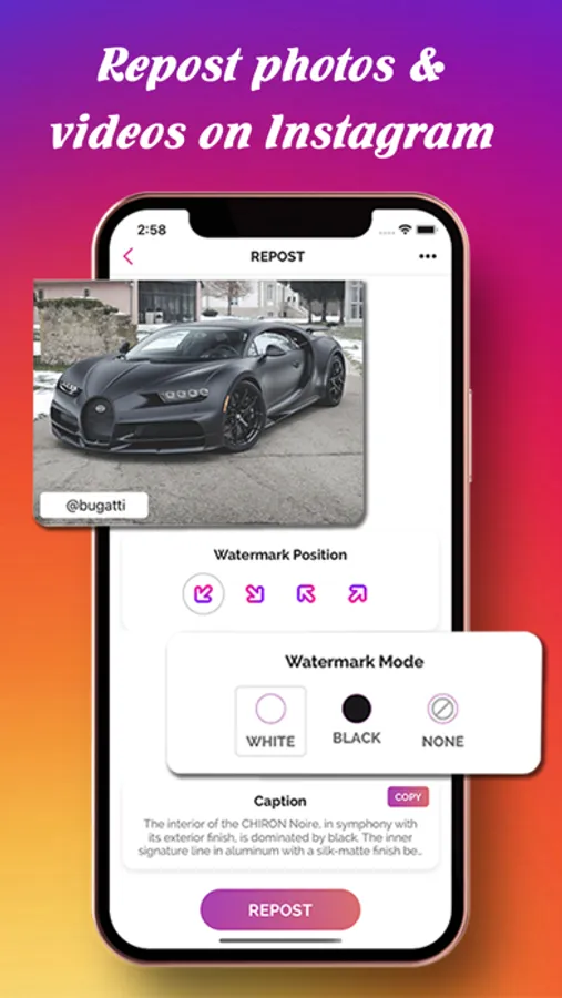 * Watermark is compulsory in Repostings to respect the copyright of the owner and can not be removed after purchase of Remove Ads in-app purchase.