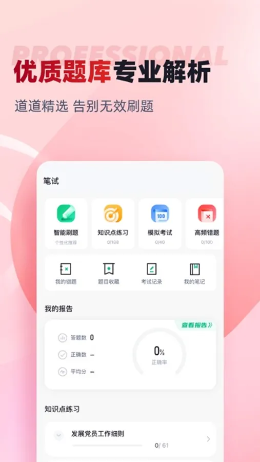 入党积极分子题库内含考点练习,全国通用卷以及地区卷模拟练习,以及按照固定考试比重的随机式的抽题的真题考场,成绩单实时记录考试数据,一点一滴的反馈考生近期学习状态以及自我正确率的提升,大大的给予考生通过考试的信心。