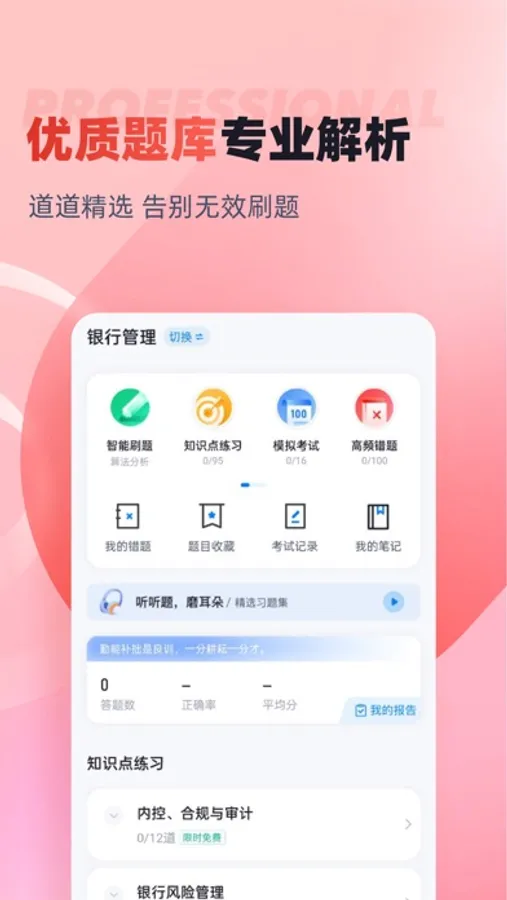 银行从业人员考试聚题库包含了《银行业法律法规与综合能力》、《银行业专业实务》。其中,《银行业专业实务》下设《个人理财》、《公司信贷》、《个人贷款》、《风险管理》、《银行管理》5个专业类别。还有针对银行从业人员考试热点、难点和常考点的考试模拟题库,更有历年真题及模拟试题题型,题库中的试题全真模拟真实的考试,是各位考生学习乃至通过考试的好帮手。