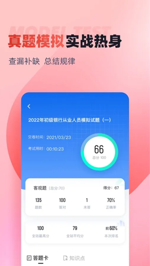 银行从业人员题库内含考点练习,全国通用卷以及地区卷模拟练习,以及按照固定考试比重的随机式的抽题的真题考场,成绩单实时记录考试数据,一点一滴的反馈考生近期学习状态以及自我正确率的提升,大大的给予考生通过考试的信心。
