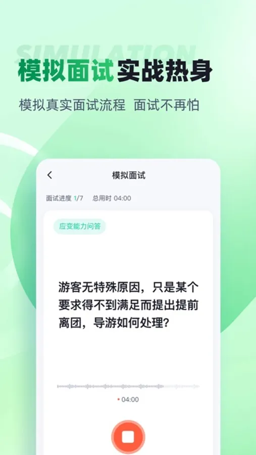 导游资格证APP新增模拟面试功能,将根据真实面试流程进行模拟考试,助力考生丰富面试语言,提高思维能力,快速适应考场