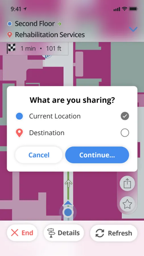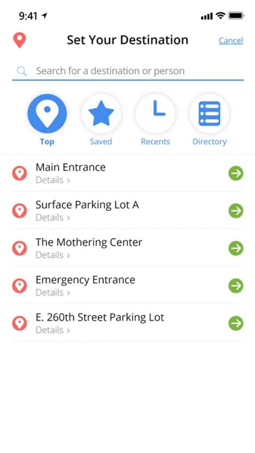 Turn-by-turn directions are provided using blue dot navigation from your starting point to your destination. The app has a searchable menu, efficient blue dot and instructional navigation, and user-friendly features such as Top Destinations, Saved Destinations and Recent Destinations.