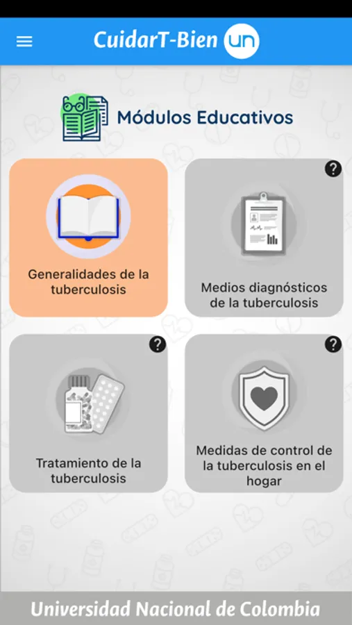 El objetivo de la aplicación CuidarT-Bien UN es fortalecer los conocimientos, actitudes y prácticas sobre la tuberculosis y aumentar la adherencia a los medicamentos, con el fin de que las personas afectadas por esta enfermedad culminen exitosamente su tratamiento. La Universidad Nacional de Colombia en coordinación con el Programa de Control de Tuberculosis de Bogotá apoyará y acompañará día a día a través de esta aplicación durante todo el tratamiento para lograr juntos el fin de la Tuberculosis, durante el tiempo que lleve el proyecto.
