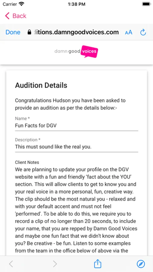 The DGV Talent App is for talent represented by Damn Good Voices only. The tools allow talent to: