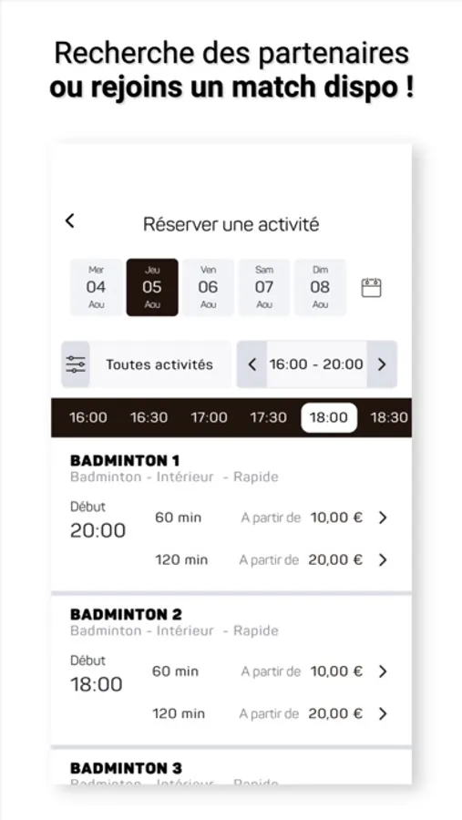 Fini la corvée de réservation ! Avec l'application tu n'as plus qu'à accéder aux créneaux disponibles et à en choisir un. Le club recevra alors automatiquement ta réservation.
