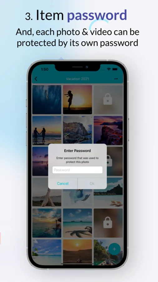 - individual photo/video/file level - by allowing to protect photo, video or file by its own password.