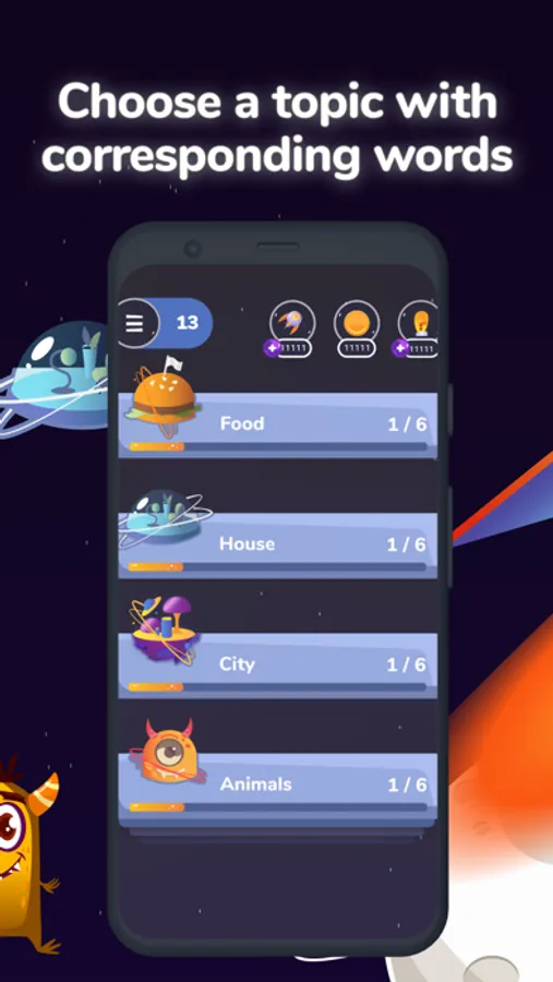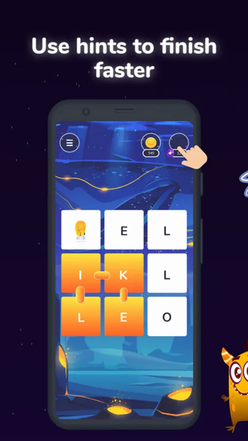 For every word you get coins, which you can use to buy hints. One hint reveals one letter on the playing field. This will allow you to pass the levels faster. With each level you pass you bring Martin closer to his pet!