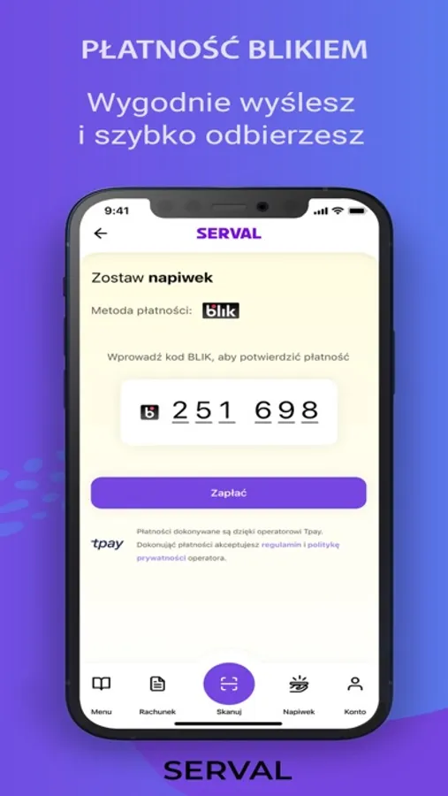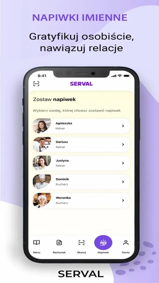 Dzięki aplikacji SERVAL możesz łatwo przekazać napiwek osobom pracującym w lokalu usługowym korzystając z elektronicznych środków płatniczych. Odbiorca napiwku otrzyma środki w sposób szybki i bezpieczny.
