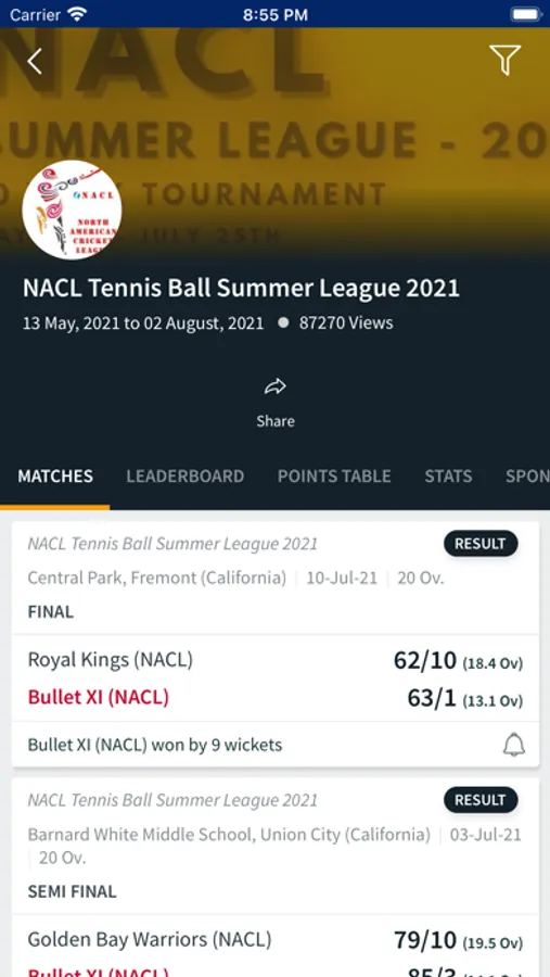 Players, organizers, and followers of this Cricket tournament can follow the LIVE scores, Leaderboard, Boundary Tracker, Points Table and much more using this app. Scores are published LIVE ball to ball to this app and on the CricHeroes app. Enjoy!
