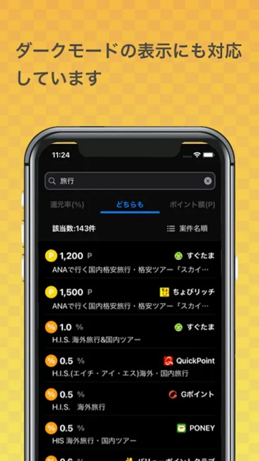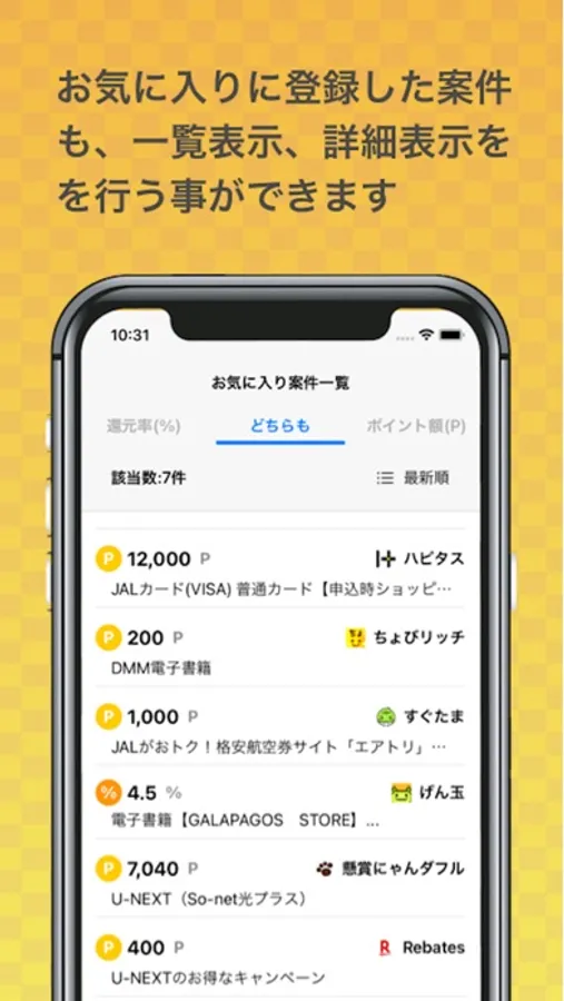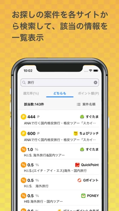 ●該当する案件のポイント額(交換時の円相当)、還元率、提供サイト、案件名を一覧で表示します。