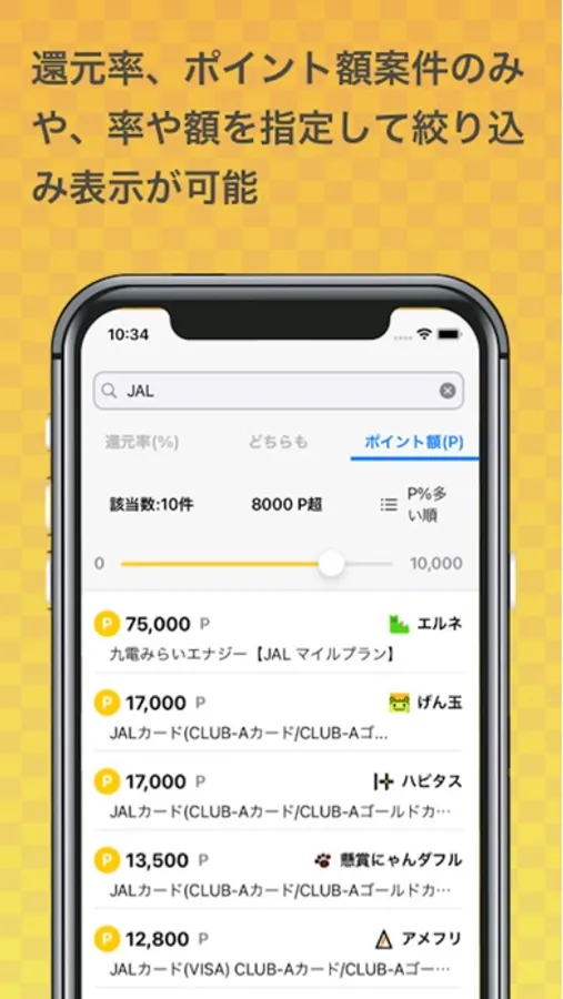 ・還元率○○%以上、ポイント額○○○P以上などで検索できます