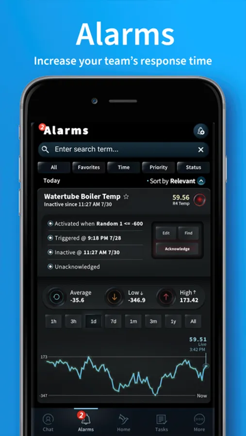 - View and manage alarms on the mobile app to view historical data, and see when they were triggered and who acknowledged them.