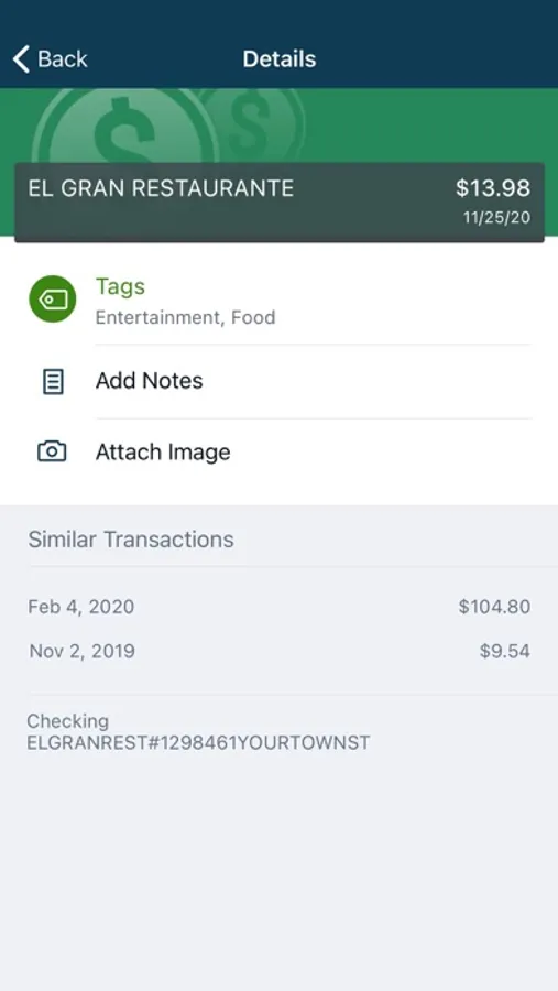 - Keep your transactions organized by allowing you to add tags, notes and photos of receipts and checks.