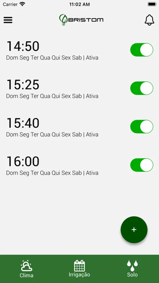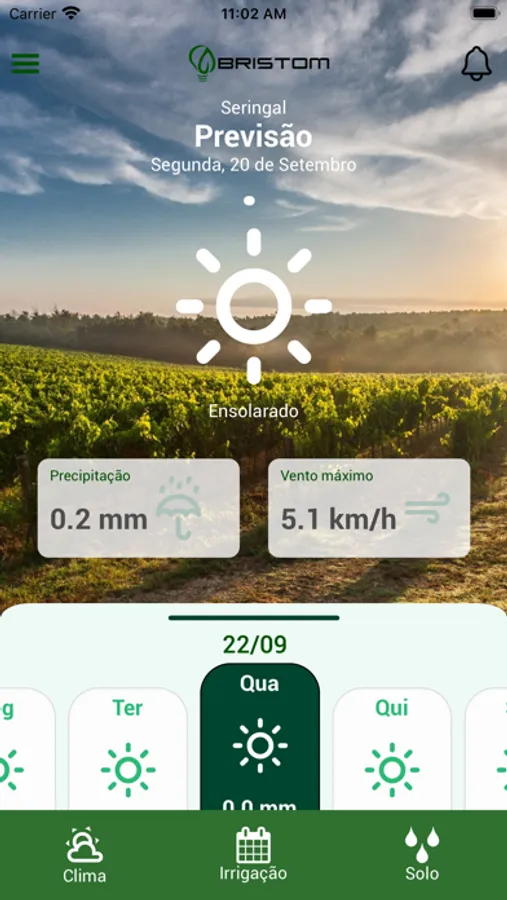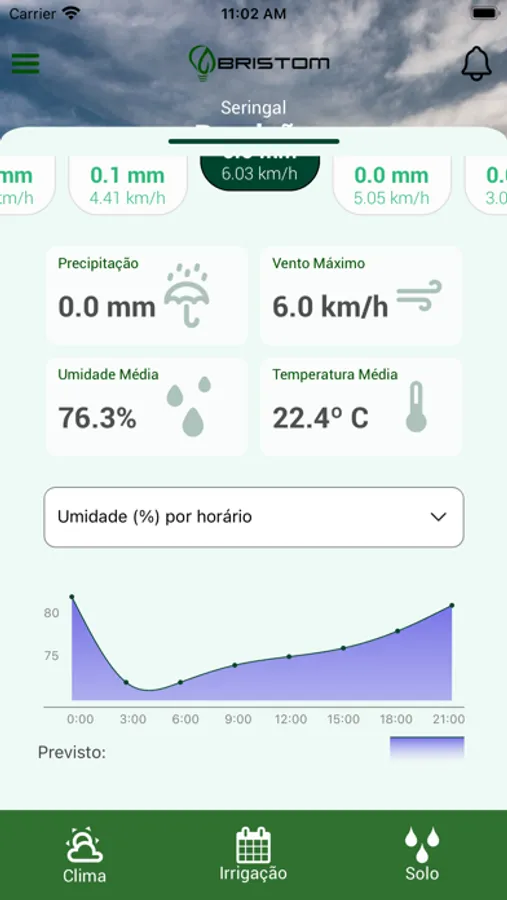 Monitore o clima da sua propriedade, umidade do solo e ainda controle seu sistema de irrigação a partir do seu celular. Integrando os dados com inteligência, o sistema Bristom realiza o manejo de clima e solo em sua irrigação de maneira autônoma, segura e eficiente, sem a necessidade de um profissional presente.