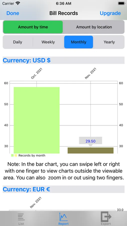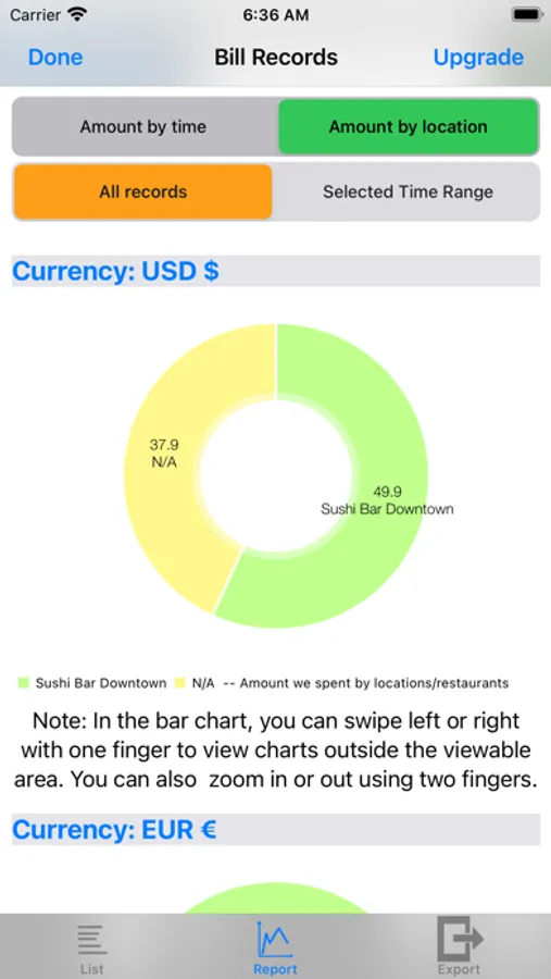 9. Bill records can be displayed in report views (In-App Purchase needed), either by date or by locations;