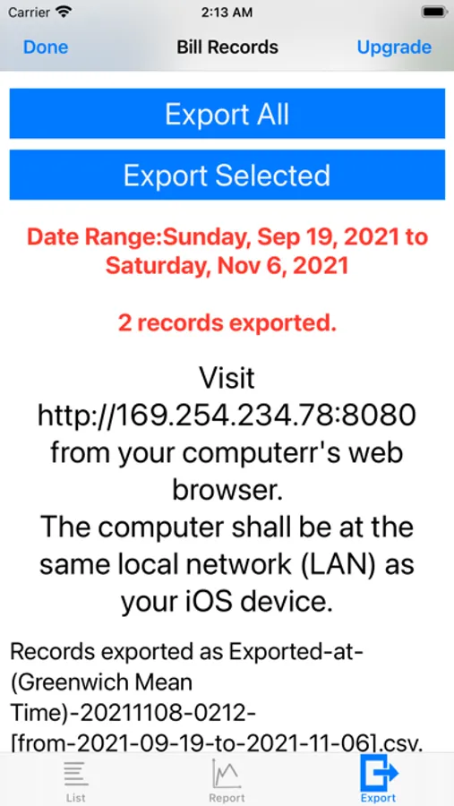 10. Bill records can be exported as .csv files to your computer, for future use;