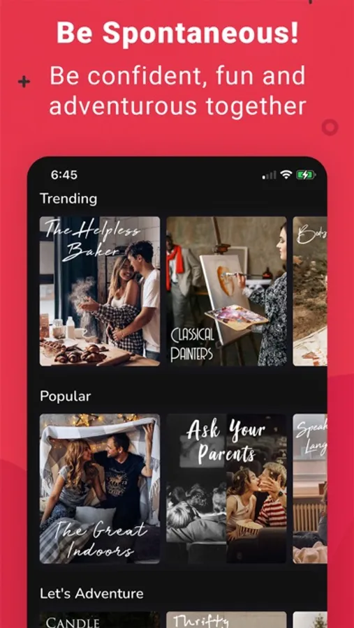 It's easy to find fun, spontaneous and creative date ideas on DativeApp! Whether you're looking to find new and exciting dates, or reignite the spark in your relationship, we've got something for couples everywhere. Plus, we’re always adding new dates so you’ll never be stuck in the same old routine!
