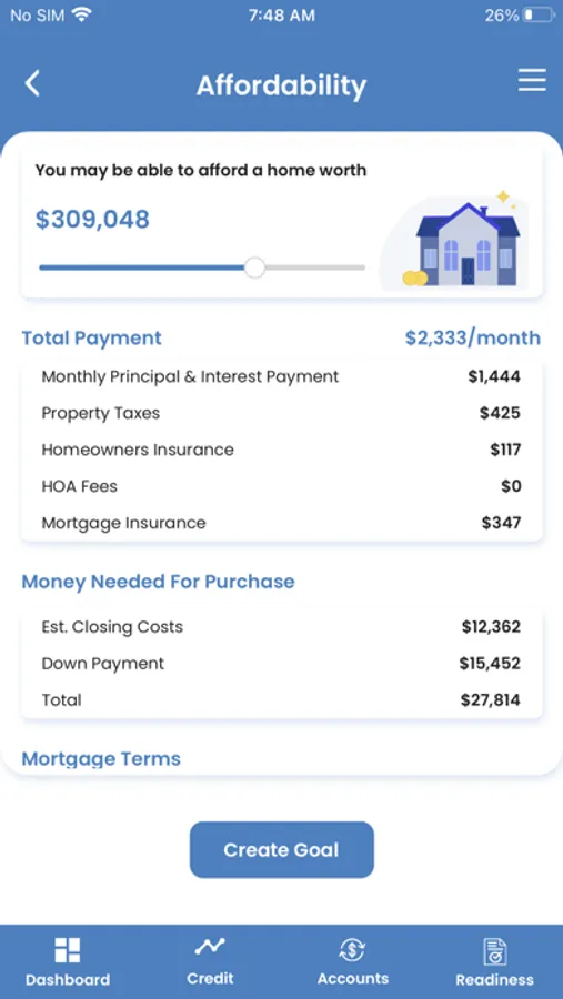 Life is one long series of credit journeys. Your LiftLocker will help you prepare for each of these journeys whether it is applying for a credit card, student loan, auto loan, or even a home loan. LiftLocker guides you through the homebuying process starting with budgeting for a down payment, building reserves for home ownership, building or improving your credit score, managing your debt-to-income ratio to make sure you can qualify for a mortgage. There is a calculator that helps you understand how much home you can realistically afford, and a readiness assessment tool that shows you the steps you need to take to be ready to apply and close on a mortgage.