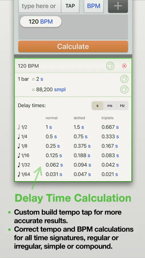 ==> Enter the BPM, or tap it, and all the delay times will be calculated, in seconds, mili seconds or Herz.