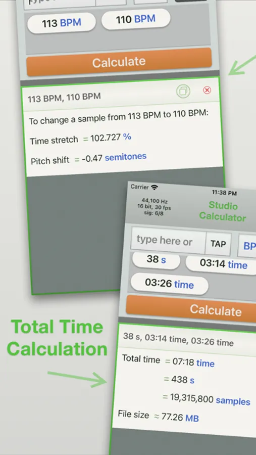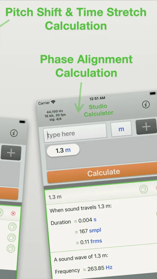 Calculate durations, BPM, frequency, delay times, time-stretch, pitch shift, phase alignment delay, file size and more, really fast and easy.