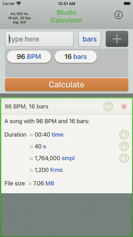 - Set sample rate, bit depth, number of mono channels, time signature and frame rate to fit your needs for all calculations.