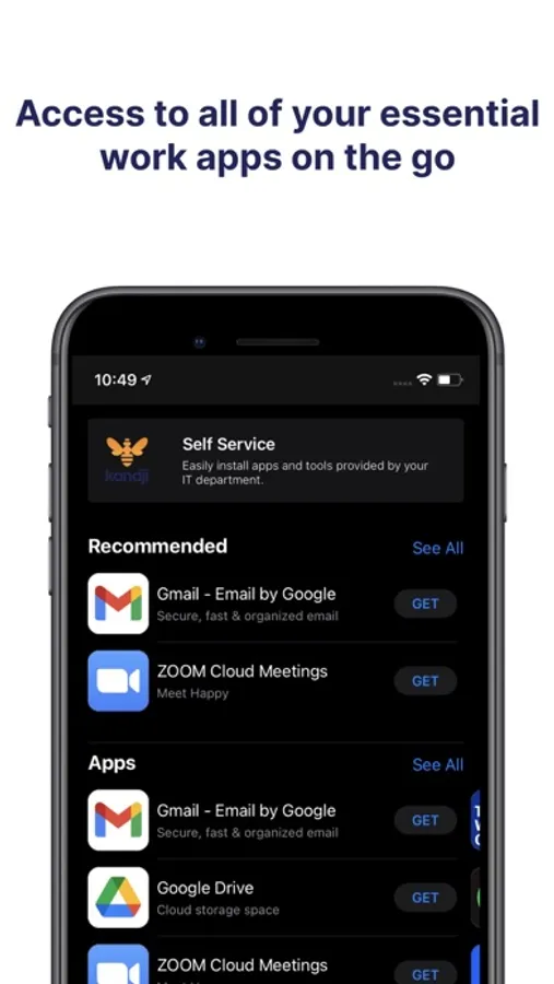 Kandji Self Service Mobile app empowers end users with a curated library of apps and tools from their IT administrators, so they can download what they need when they need it without asking IT, and be more productive on the go with their Kandji enrolled mobile devices.