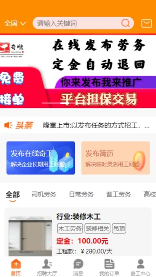 本平台会员可于平台内发布用人需求或接取用人订单,两方通过定金达成协议,线下完成工