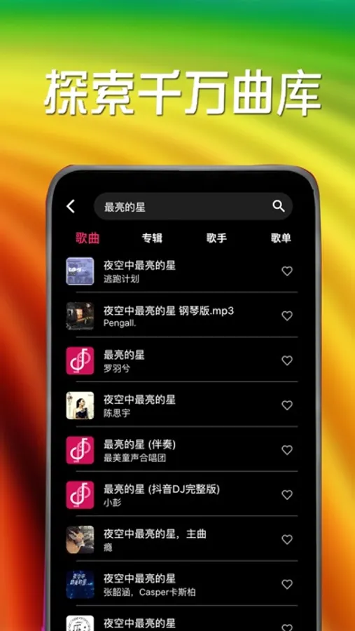 输入歌名、歌手名或者歌词在千万曲库中找到免费歌曲。