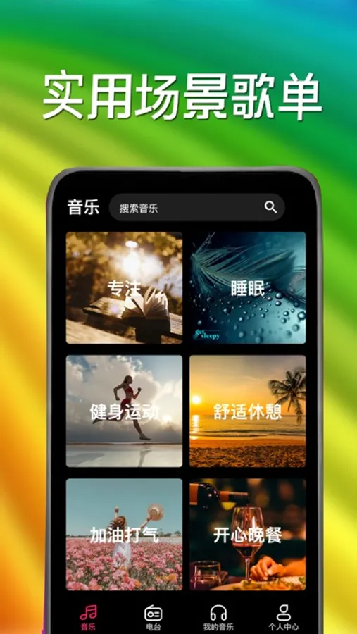网罗有用的场景歌单:专注、睡眠、运动健身、休憩、加油打气、开心晚餐、怀旧、浪漫。
