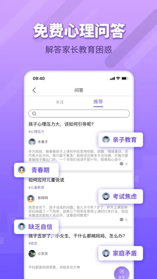 在线心理交流互动平台,可围绕亲子教育、成长烦恼、情绪困扰、职场人际、婚姻家庭、学生学习等诸多话题展开讨论,平台入驻心理咨询专家将会提供免费在线解答。同时,还会不定期组织专家团队针对心理问题展开直播讲座,让用户与专家连线面对面。