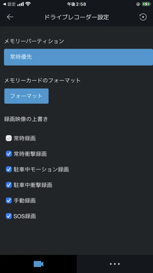 衝撃感度やスーパーナイトビジョン等、録画機能の設定を変更することができます。